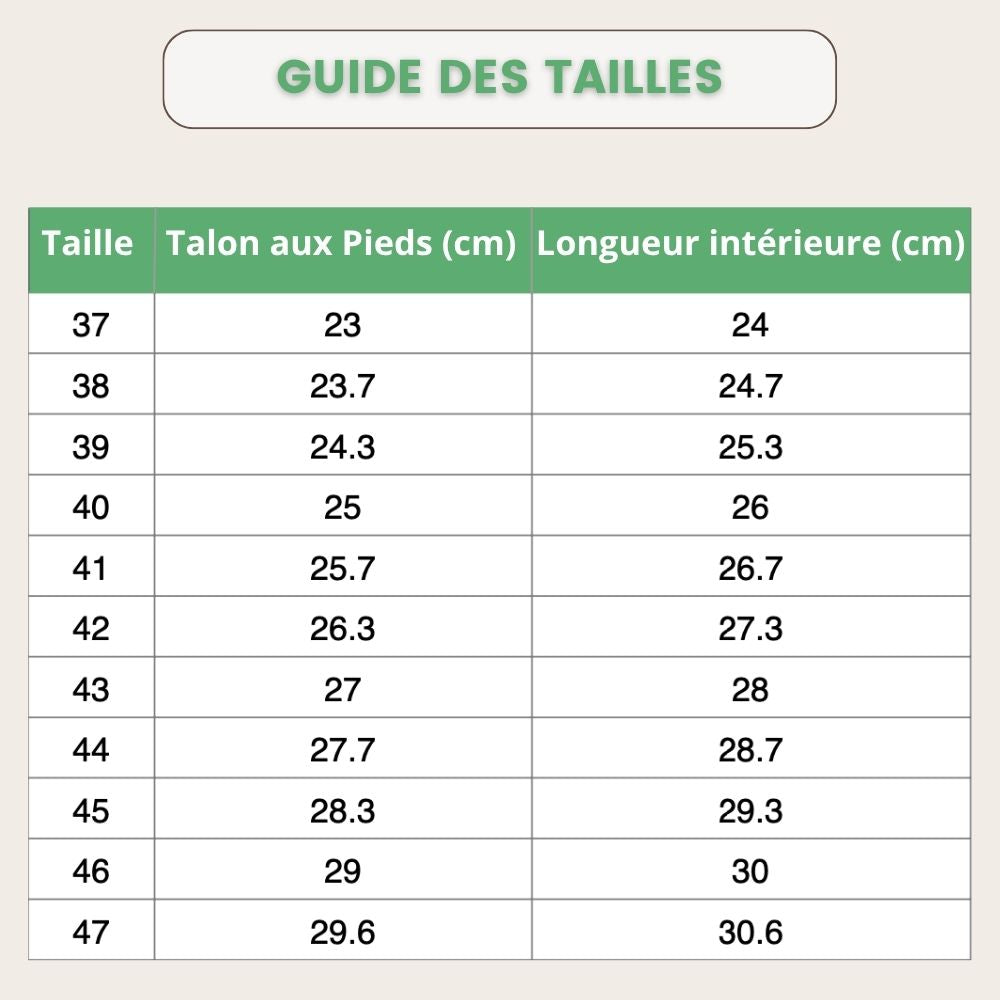 Mesurer le pied debout et suivre précisément le guide des tailles. Les échanges et retours sont gratuits sous 30 jours si la taille ne convient pas.