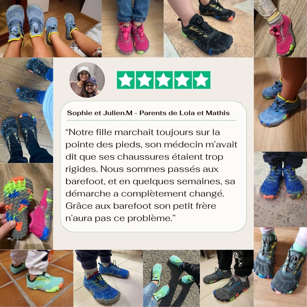 Contrairement aux baskets classiques qui enferment les pieds, nos barefoots sont conçues pour suivre la forme naturelle du pied de votre enfant, sans jamais la forcer.