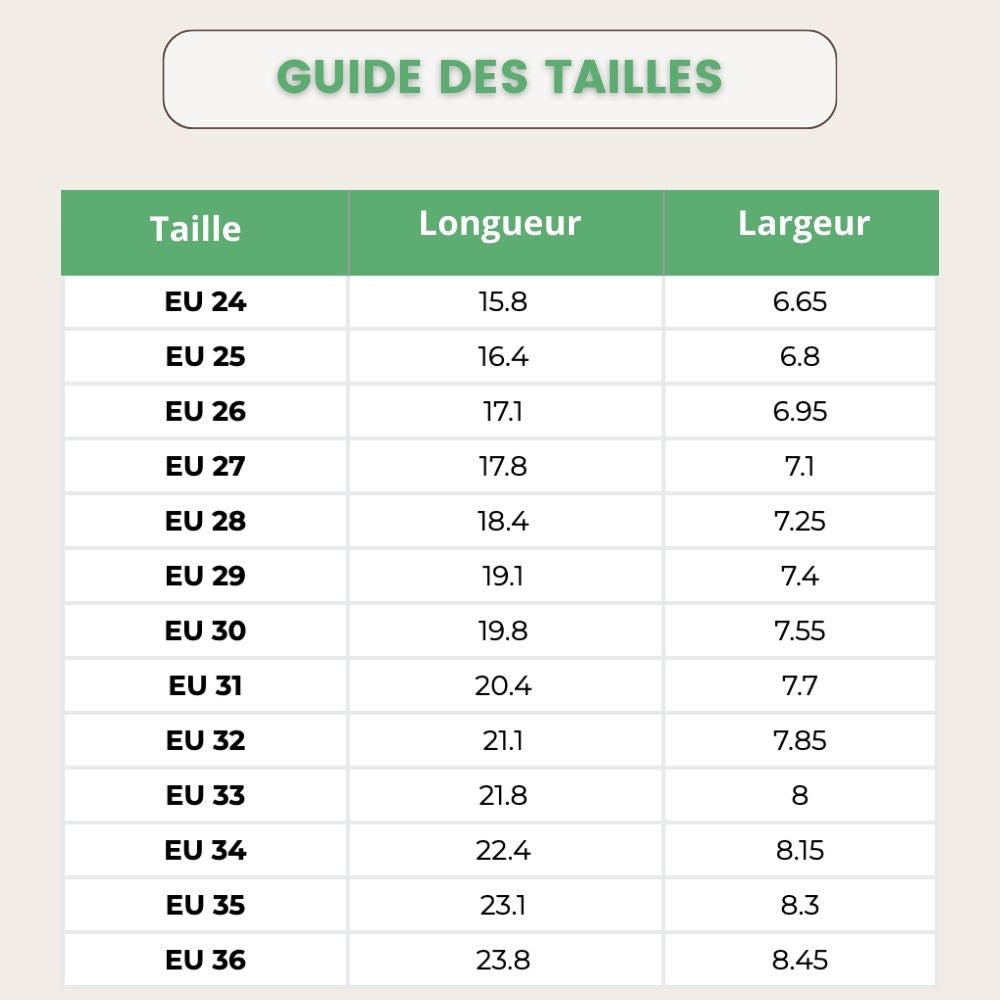 Il suffit de mesurer la longueur du pied de votre enfant et de comparer avec notre guide des tailles. En cas de doute, mieux vaut prendre un peu plus grand pour laisser de la place à la croissance.