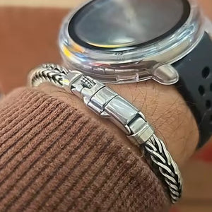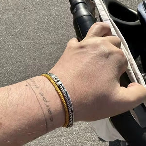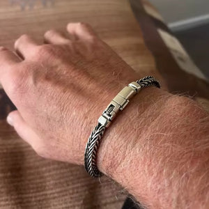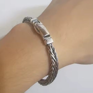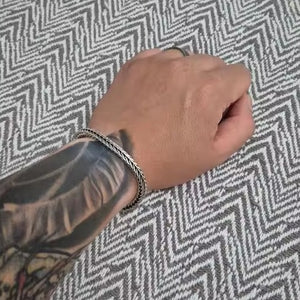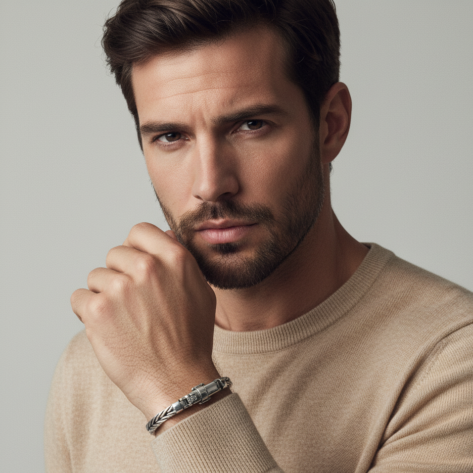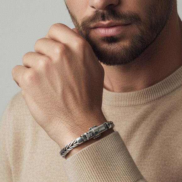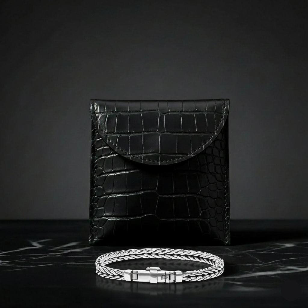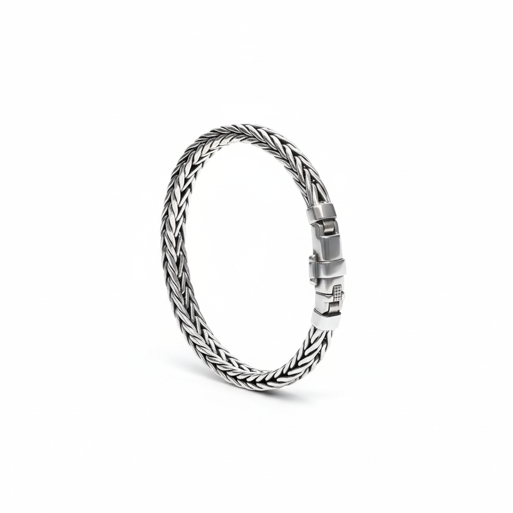 Symbole d’élégance contemporaine, ce bracelet en argent massif tressé à la main incarne la puissance maîtrisée et le goût du détail. Chaque brin d’argent est patiemment travaillé, formant une tresse fine et régulière qui reflète la lumière avec une intensité subtile.