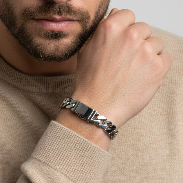 Pensé pour l’homme sûr de lui, ce bracelet incarne la puissance tranquille et l’élégance contemporaine. Chaque maillon, sculpté avec précision, reflète la solidité et le charisme de celui qui le porte — un homme de caractère, confiant et résolument moderne.