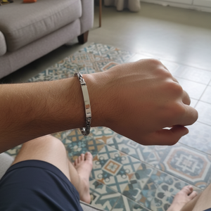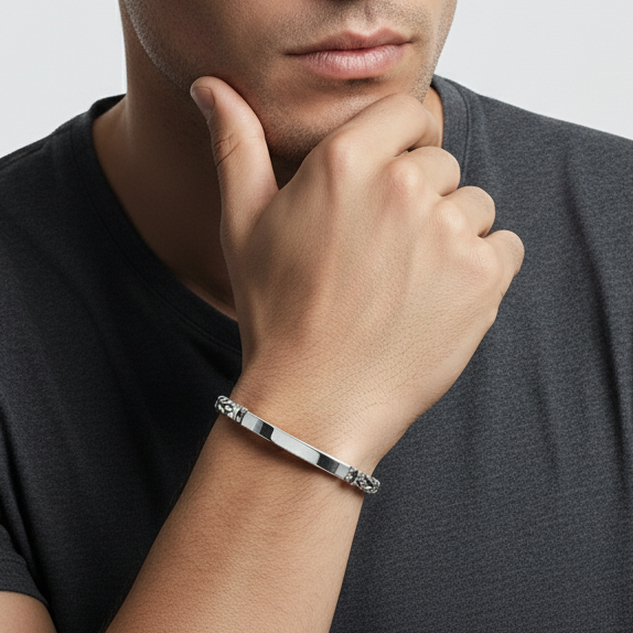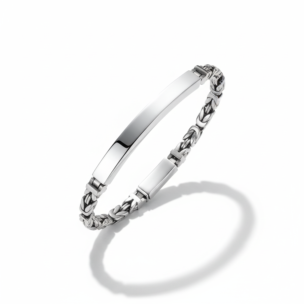 Ce bracelet en argent, à la maille sculptée et au poli miroir, exprime une virilité élégante et une charisme puissant.